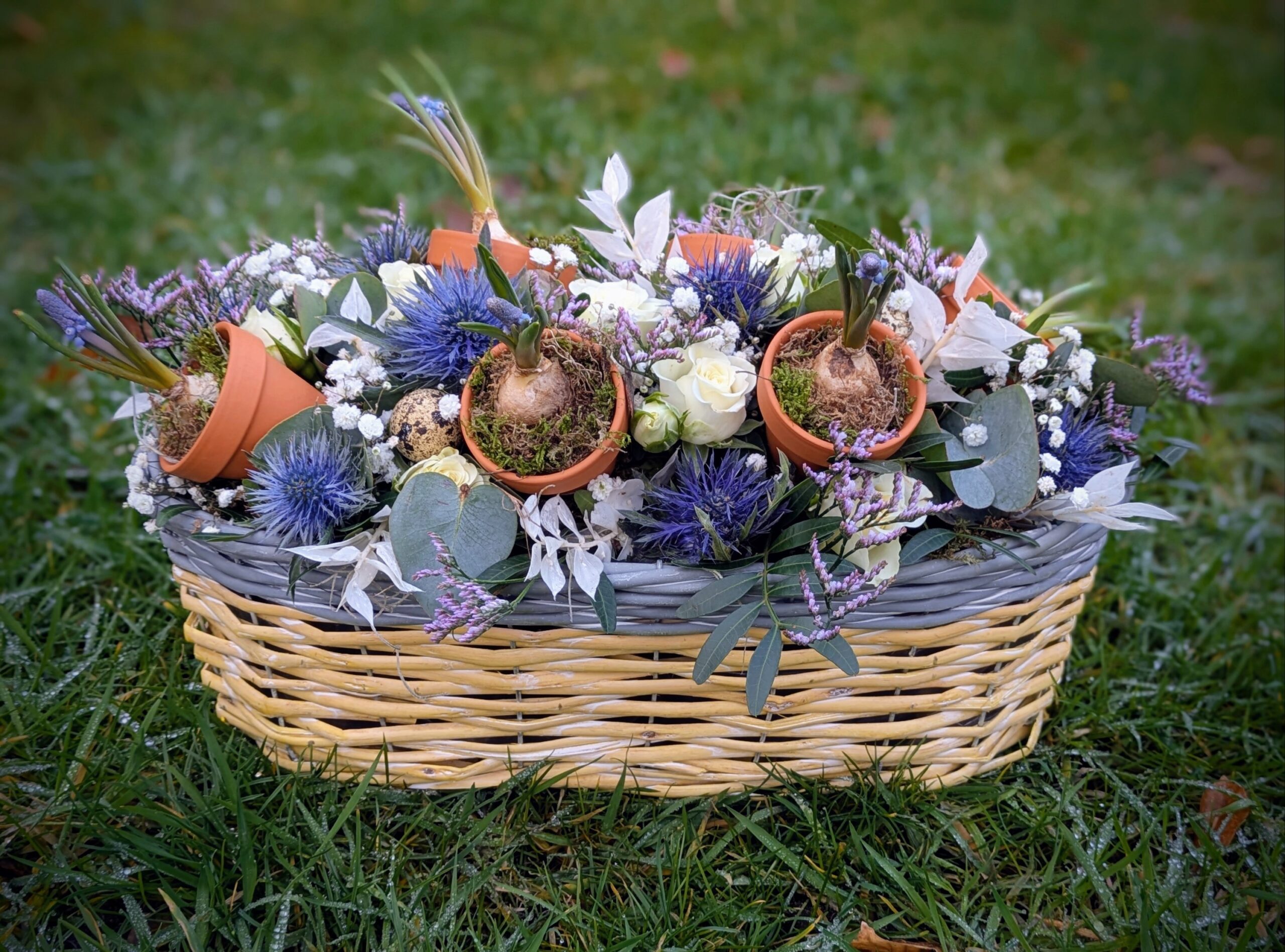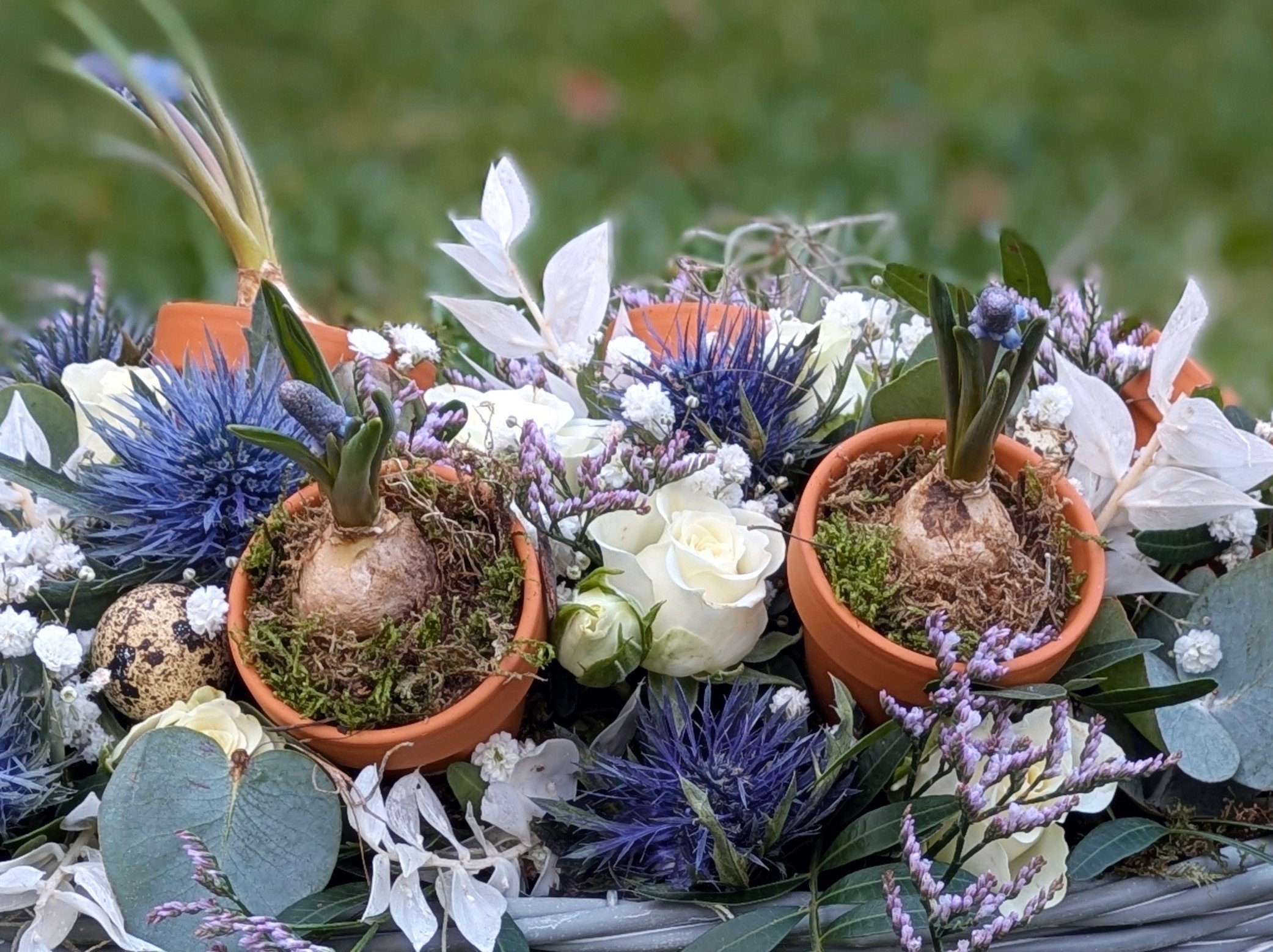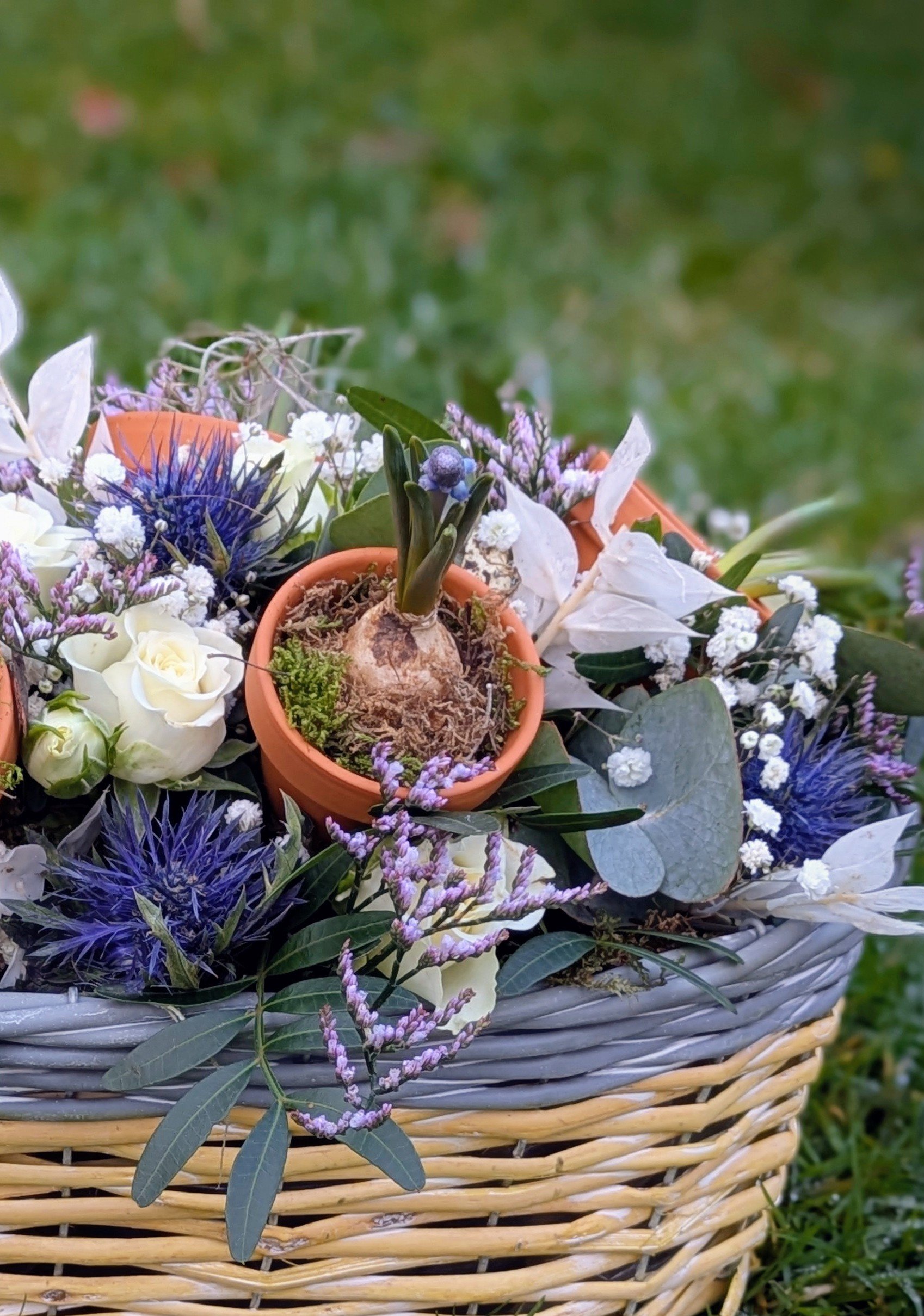 In de stilte van de winter dient het voorjaar zich al voorzichtig aan… Stille Lentebode is een puur en natuurlijk bloemstuk, met zachte tinten en bolletjes die langzaam tot leven komen 🤍 Een fijn DIY-moment om even stil te staan, te creëren en vooruit te kijken naar wat komt. Mooi om zelf te maken, of samen aan tafel tijdens een rustig creatief moment. Het stuk bestaat uit een mooie mand gevuld met Eucalyptus en Pistache Groen. Gezellige terracotta potjes gevuld met blauwe druifjes. Distels, Limonium, Sneeuwwitte roosjes en gipskruid.