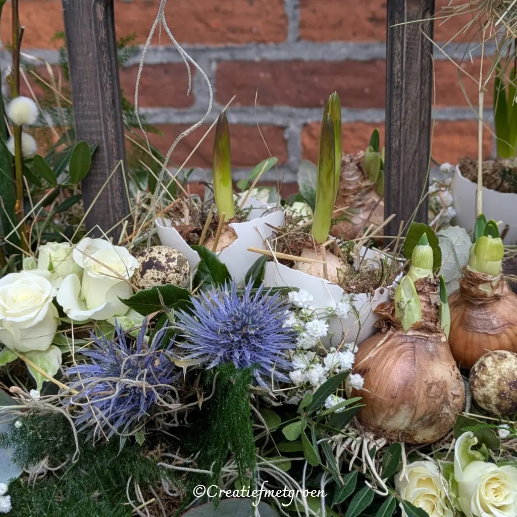 De Blauwe Druifjes en de Narcis Bridal Queen komen mooi in bloei waardoor het stuk steeds een beetje in beweging is en daardoor leuk blijft om naar te kijken.