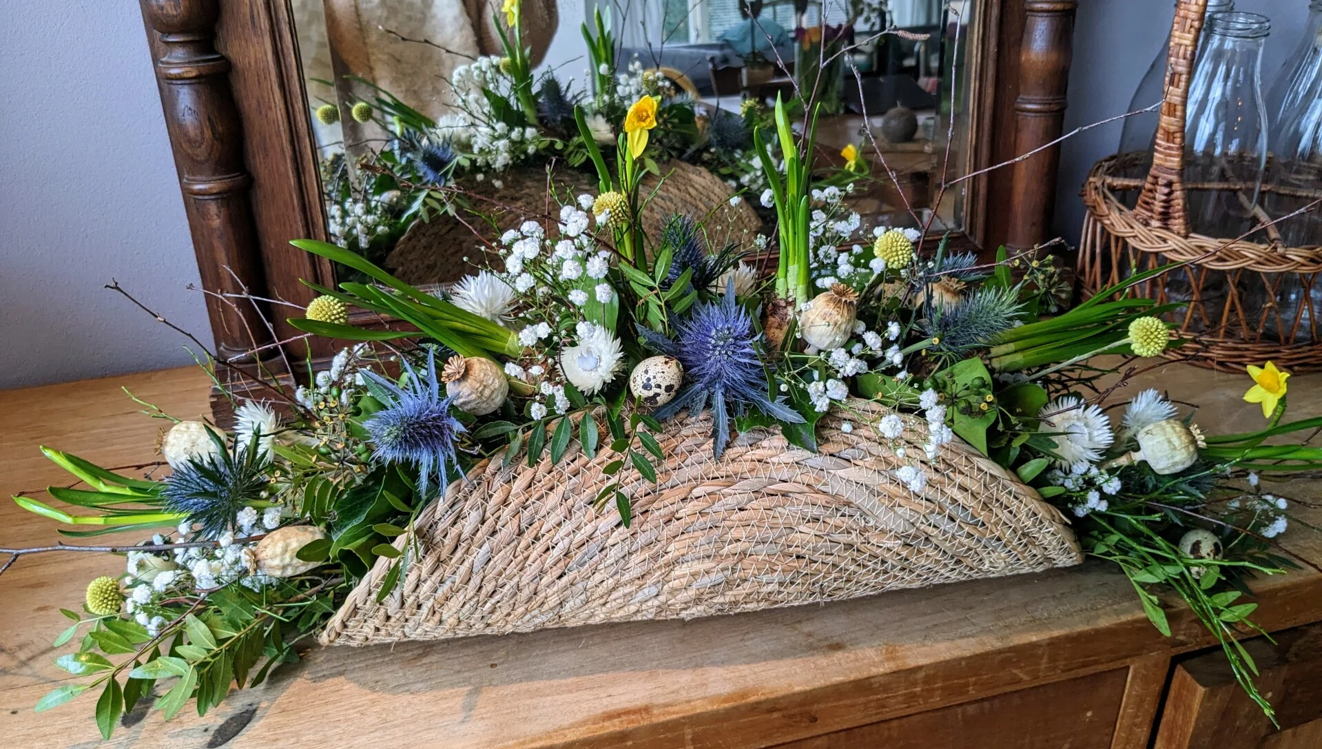Het stuk is gemaakt met narcissen, distel, pistache groen, berkentakken, gipskruid, kwarteleitjes, craspedia hedera papaver en witte droog bloemetjes.