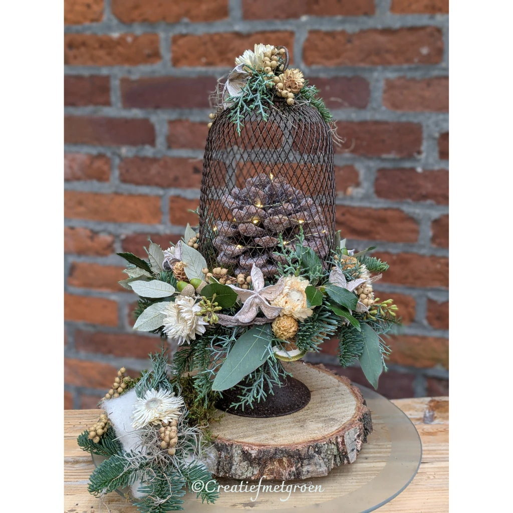 Breng warmte, sfeer en een vleugje luxe in huis met dit DIY pakket Winter Belle. De prachtige XL gewaxte dennenappel vormt het hart van het arrangement, omringd door fris groen, subtiele winterdetails en een sfeervol lichtjessnoer dat het geheel laat stralen. 🌿✨ Dit stijlvolle winterstuk is opgebouwd op een stoere berkenhouten schijf en gevuld met natuurlijke materialen van hoogwaardige kwaliteit.